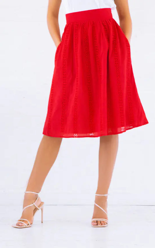 Red Embroidered Organic Cotton Midi Skirt
