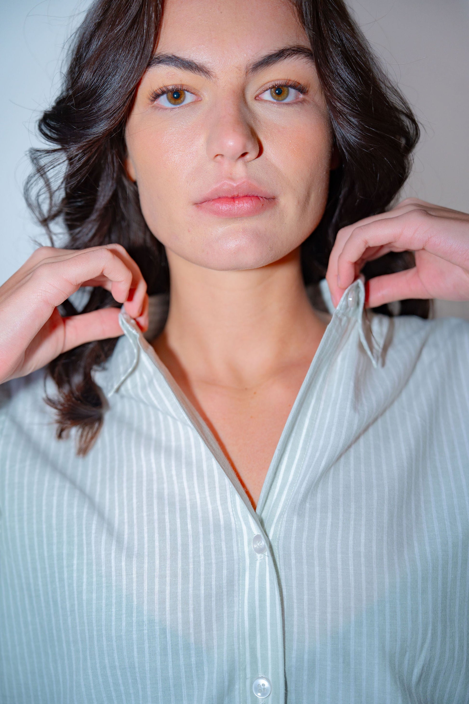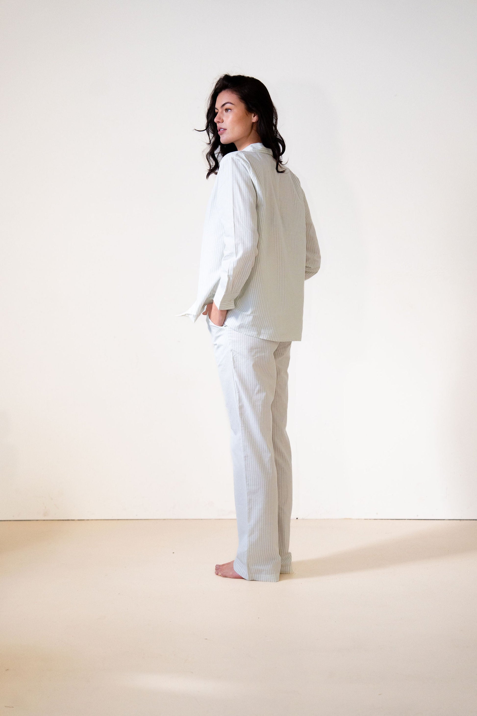 Button down shirt with long sleeves, with matching trousers in a grey-green and white stripe.