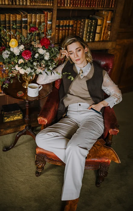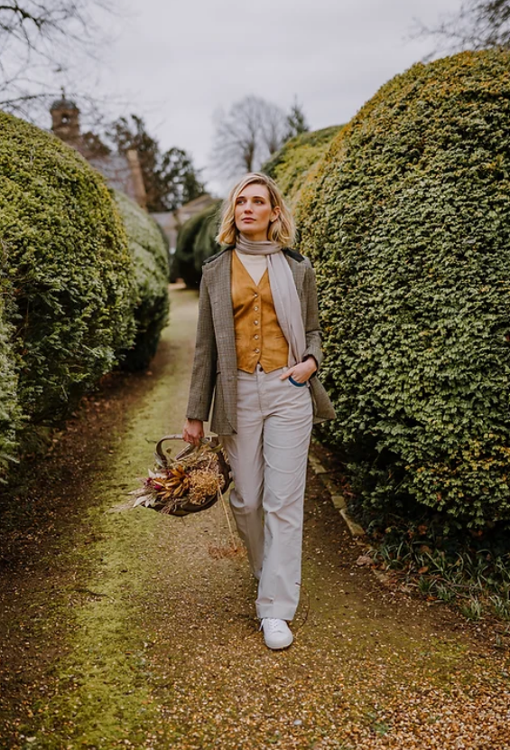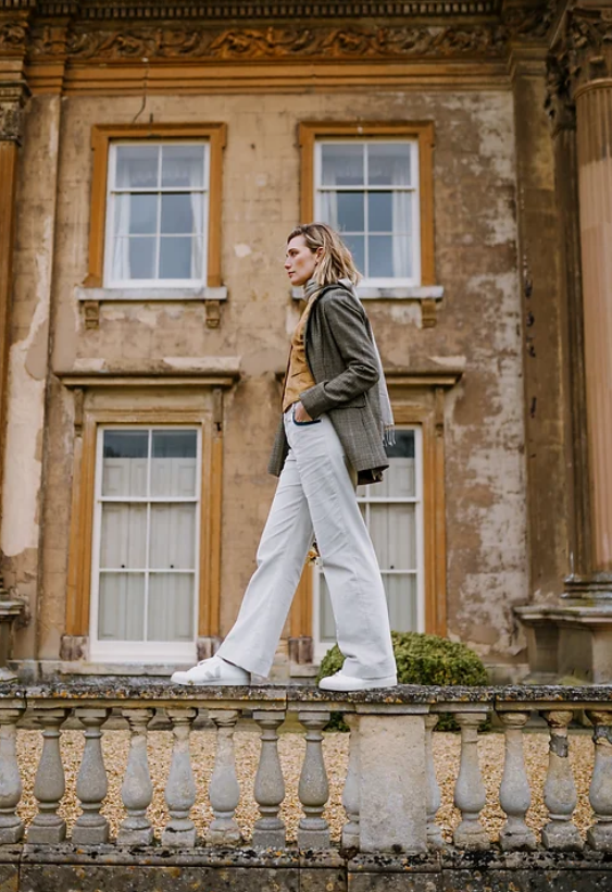 Our Gaia corduroy trousers in stone are made in a lightweight super soft cotton needlecord and feature a contrasting teal velvet trim on the pockets. Exceptionally comfortable to wear they can be worn all year round and look just as good in the country as they do in town. They are a wide legged, mid-rise fit and have been beautifully tailored, hand cut and made in London in small batches.