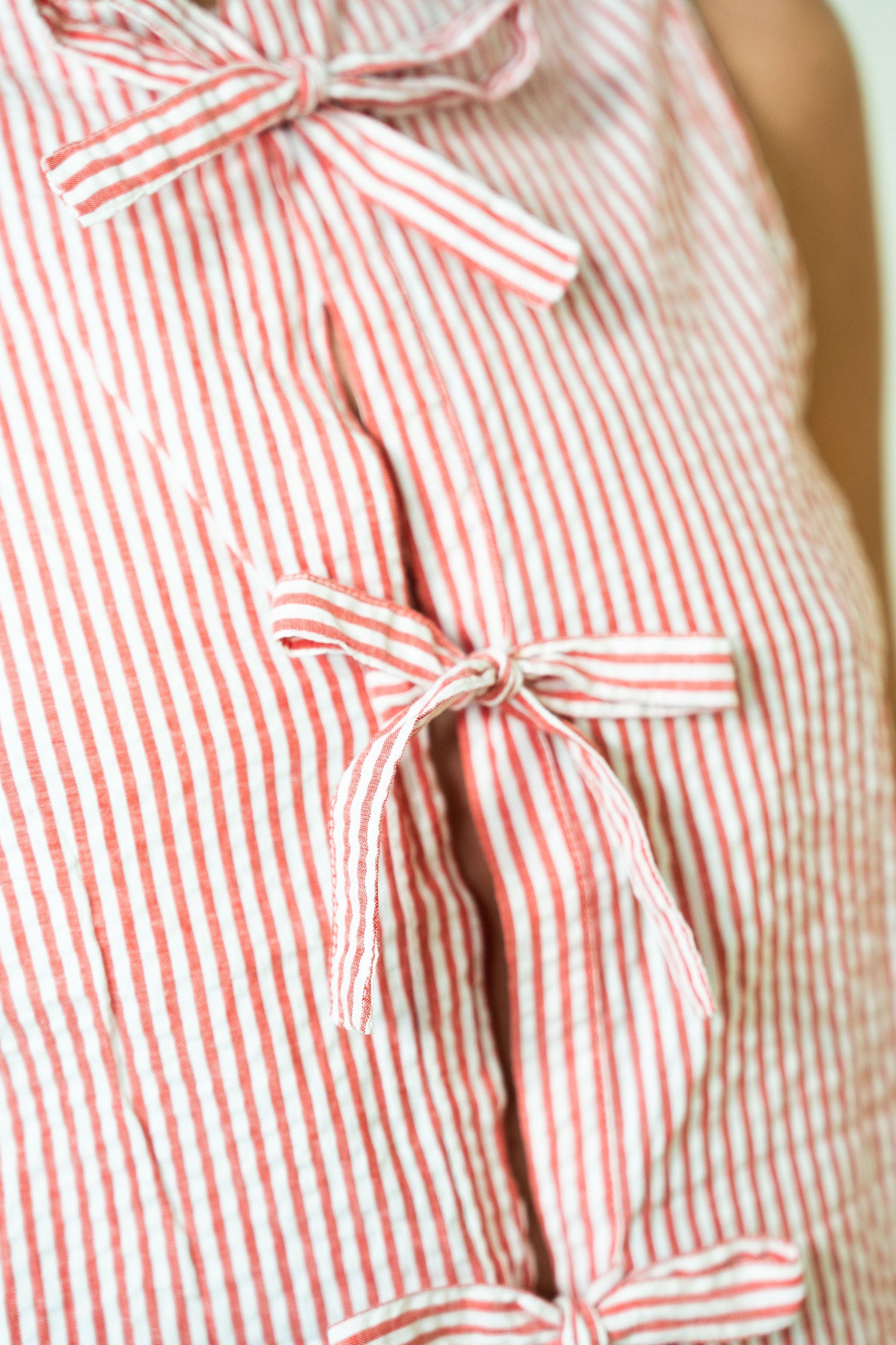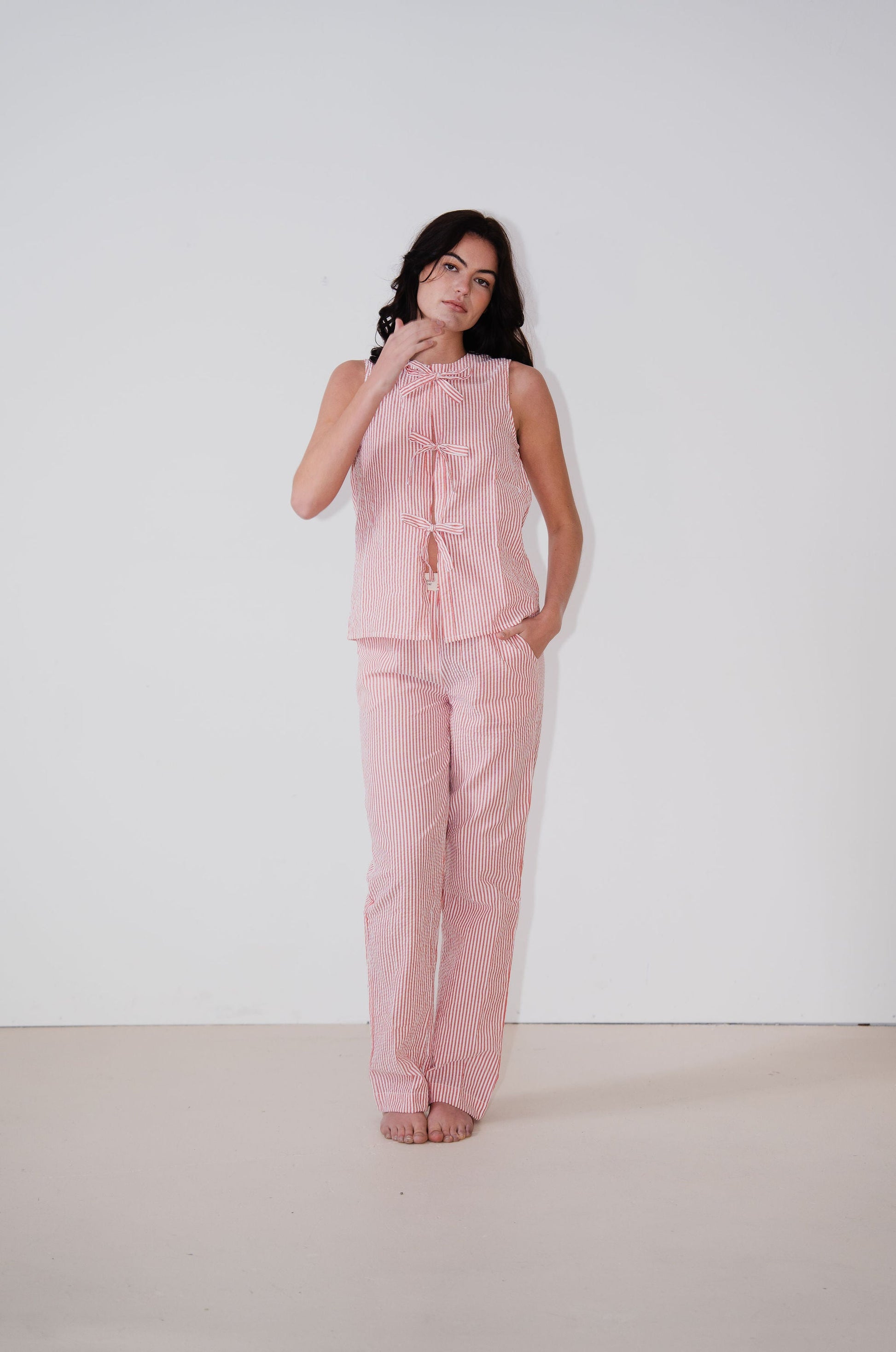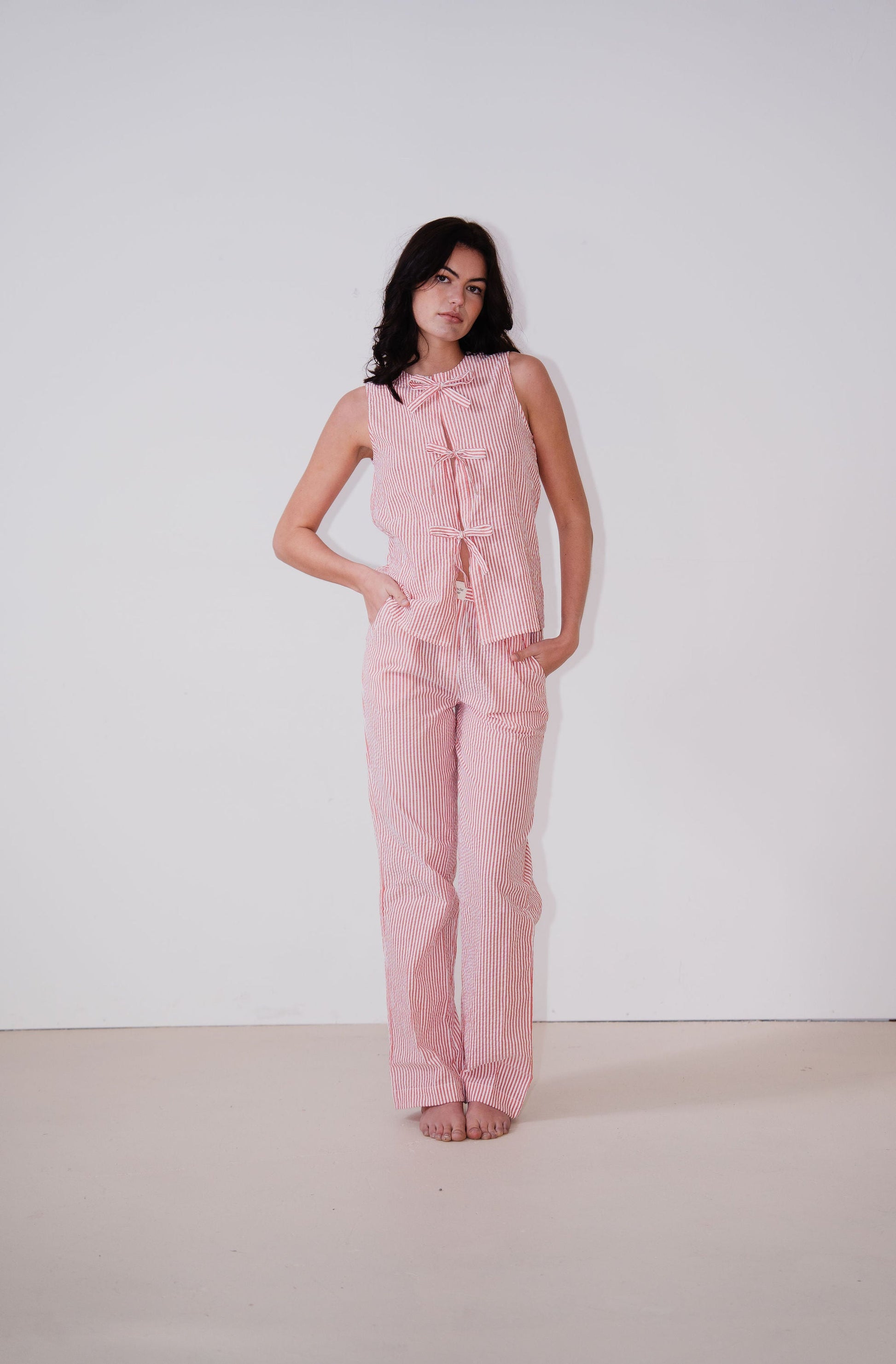 Tie front sleeveless shirt in a red and white, seersucker stripe.