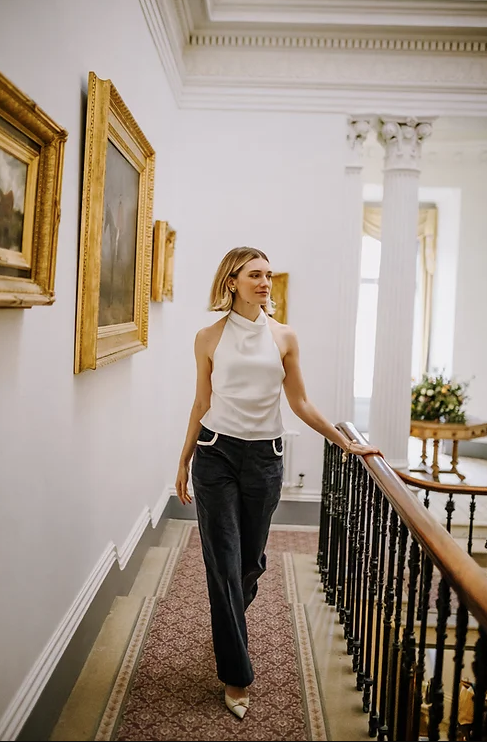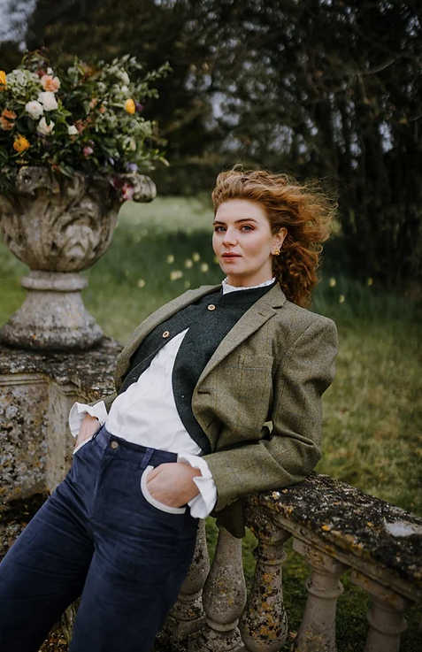 Our Gaia corduroy trousers in stone are made in a lightweight super soft cotton needlecord and feature a contrasting teal velvet trim on the pockets. Exceptionally comfortable to wear they can be worn all year round and look just as good in the country as they do in town. They are a wide legged, mid-rise fit and have been beautifully tailored, hand cut and made in London in small batches.