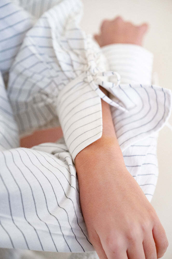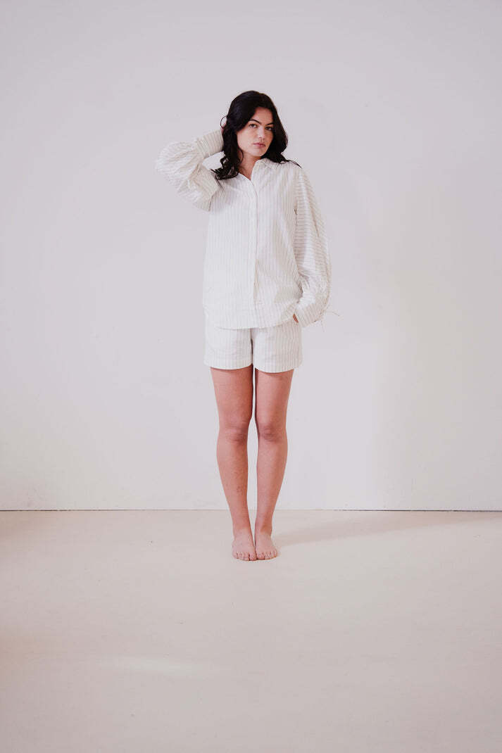 Oversized shirt, with matching shorts in a dark grey and eggshell pinstripe.