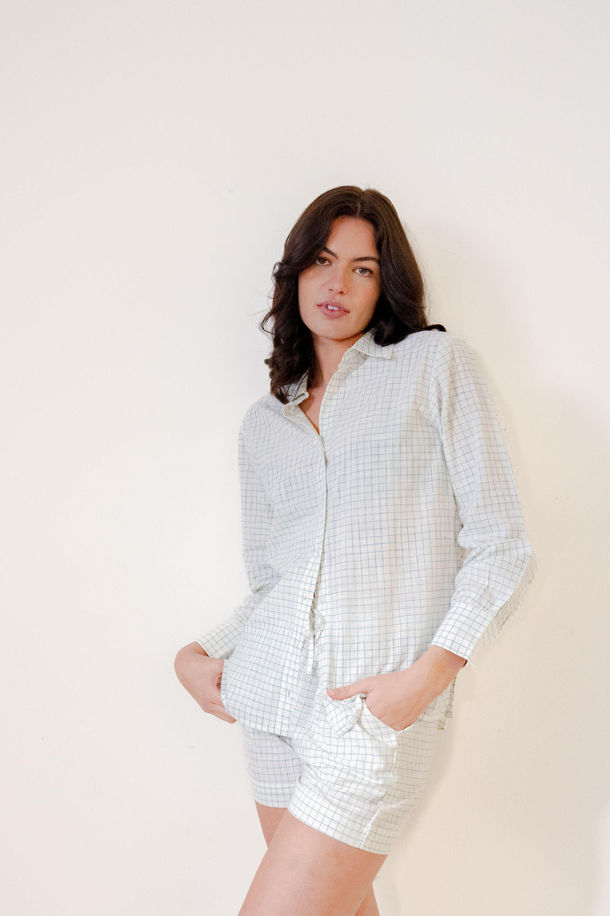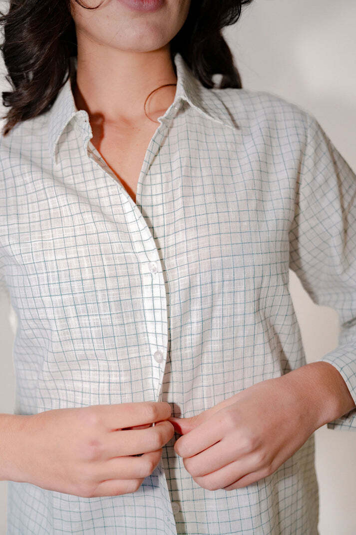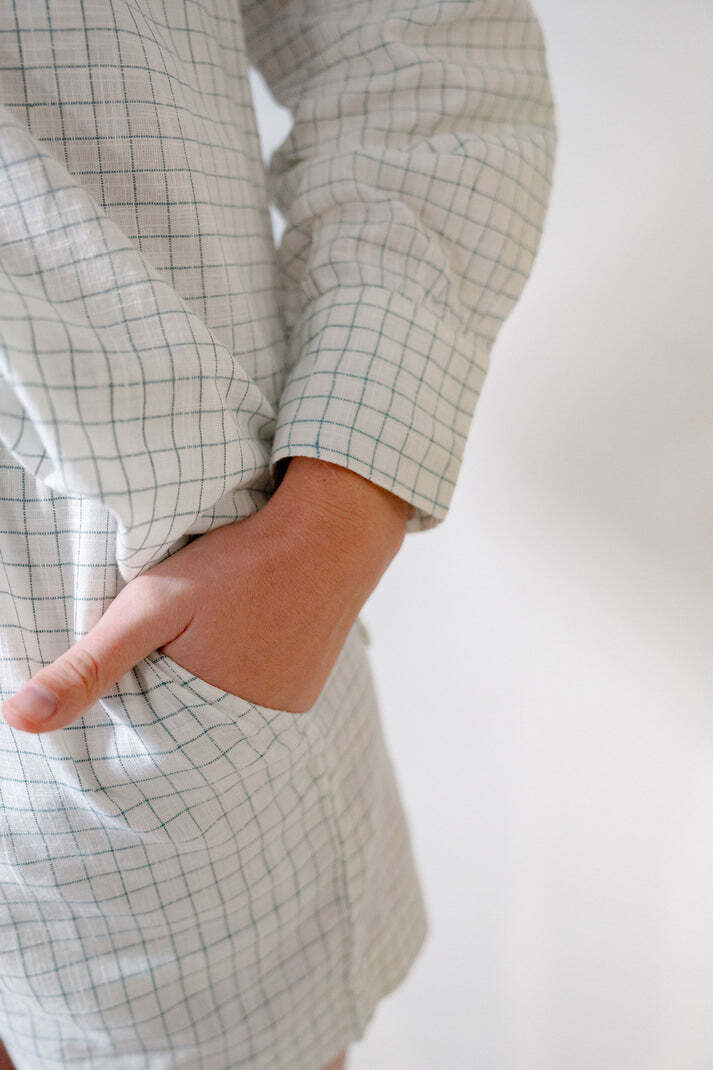 Oversized shirt, with matching shorts in a green and white thin check.