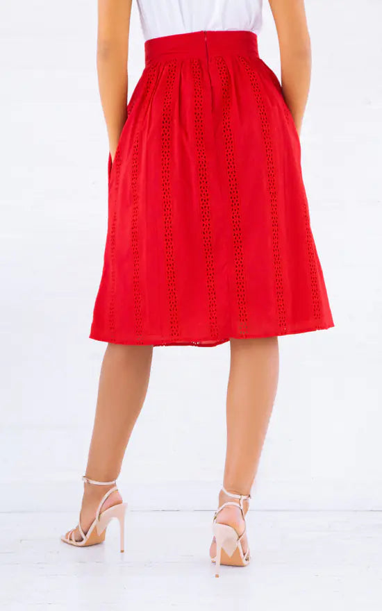 Red Embroidered Organic Cotton Midi Skirt