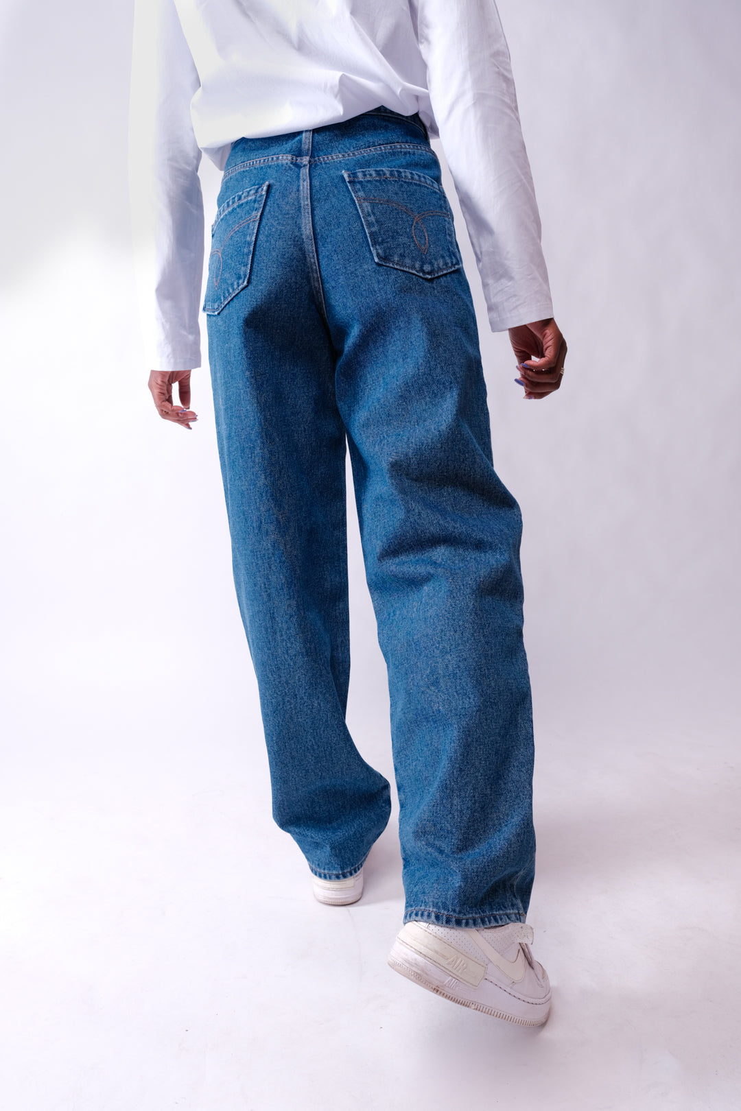 Tall, baggy denim jeans pants, suitable for tall women (87 cm inseam). These high-waisted denim pants are a product to have in your wardrobe. This cut of pants is timeless and 100% comfortable. Fereeg offers it to you with the perfect measurements for women with long legs, it is not short and creases at the ankle are visible. The design sewn on the back pockets adds uniqueness to the product.